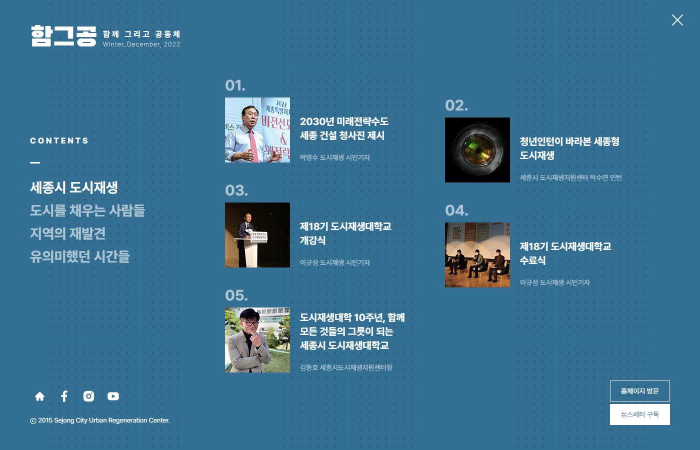세종도시재생지원센터는 지역을 특화한 창조와 혁신의 성장 거점을 구현하기 위해 도시에 숨겨진 자원을 발굴하여 자생적 성장기반을 만들어 가는 기관입니다. 센터의 뉴스레터는 다양한 콘텐츠를 효과적이고 유용하게 전달하는 것을 목적으로 정적이면서 단정한 컨셉을 기준으로 디자인 되었습니다.