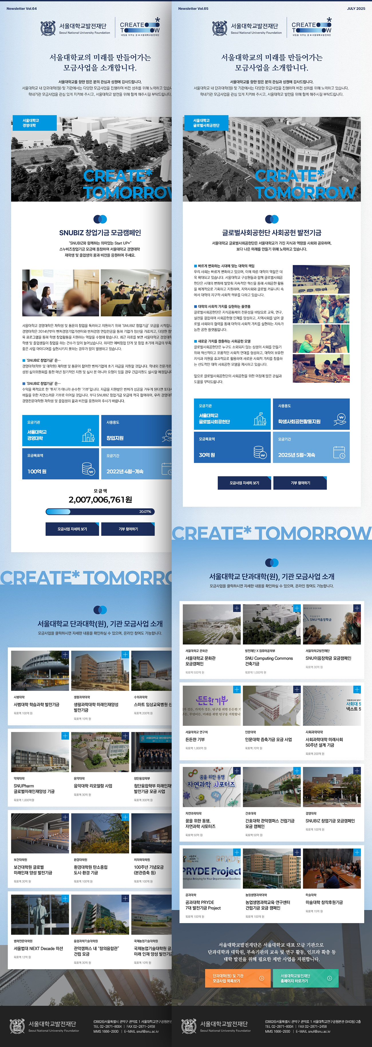 뉴스레터의 상단 메인 영역은 서울대학교 캠퍼스 전경을 활용한 흑백 이미지와 함께, ‘CREATE TOMORROW’ 타이포그래피로 재단의 비전과 상징성을 전달하고자 하였습니다. 메인 콘텐츠는 카드 형식의 박스 디자인과 컬러 포인트를 통해 구분감을 주고, 주요 모금 사업을 직관적으로 탐색할 수 있도록 정보 흐름을 정리했습니다. 일관된 아이콘, 색상, 버튼 스타일을 사용해 브랜드 아이덴티티를 유지하면서도 정보 전달에 집중할 수 있는 환경을 제공하였습니다.
