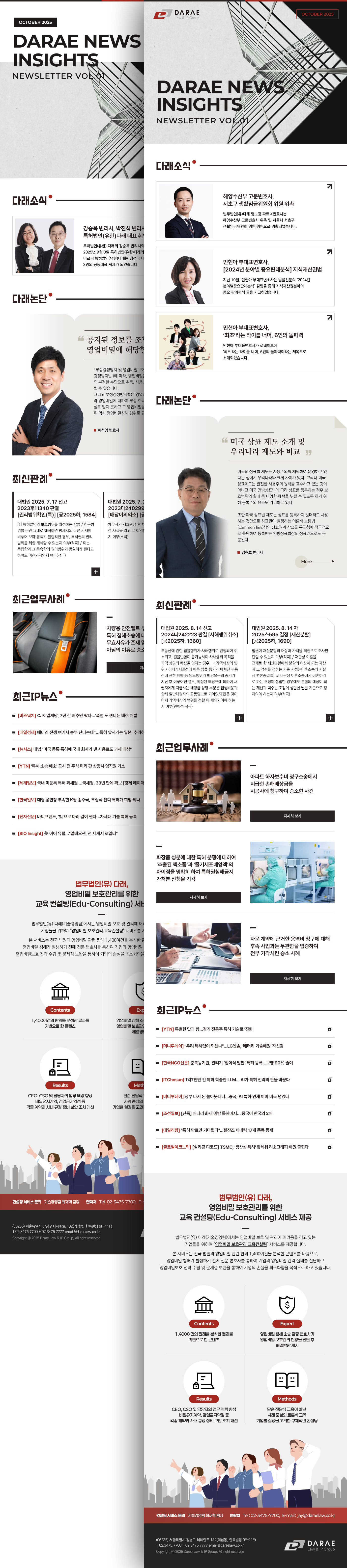이번 DARAE NEWS INSIGHTS 뉴스레터는 로펌이 지닌 전문성과 신뢰를 보다 세련된 인상으로 전달하고자 디자인 하였습니다. 전체 구성은 불필요한 장식을 줄이고 정보의 흐름과 시각적 질서를 중심으로 설계하여, 다양한 법률 인사이트가 되도록 차분하면서 밀도 있게 전달될 수 있도록 하였습니다.