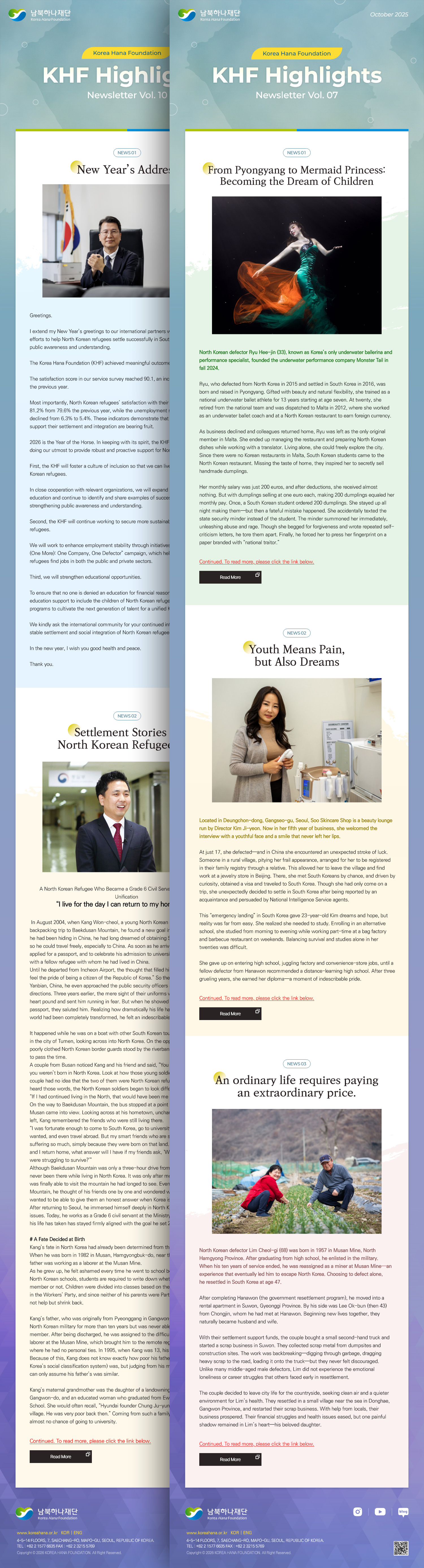 전체적으로는 과도한 장식보다는 읽는 경험 자체에 집중할 수 있도록 절제된 레이아웃과 명확한 구분을 통해, 재단의 메시지가 차분하게 전달될수 있는 뉴스레터를 만들고자 하였습니다.